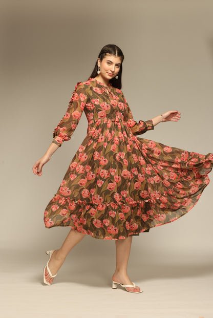 Olive GreenFloral Printed Flared Dress